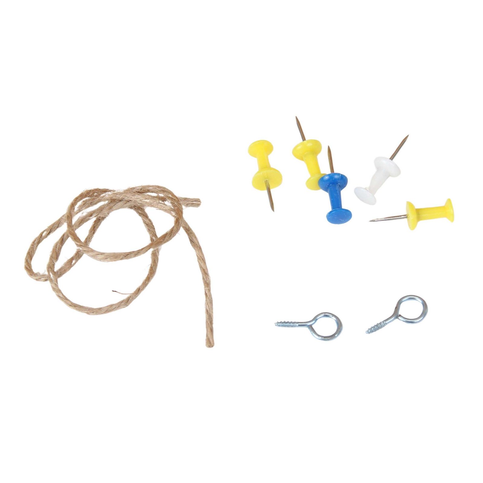 Kamštinė lenta, medinis rėmas, komplekte 4 smeigtuka, dvi kilpelės ir virvelė pakabinimui.