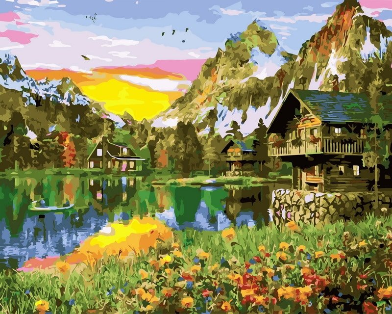 TPS “Ežero pakrantės kalnų nameliai saulėlydyje”