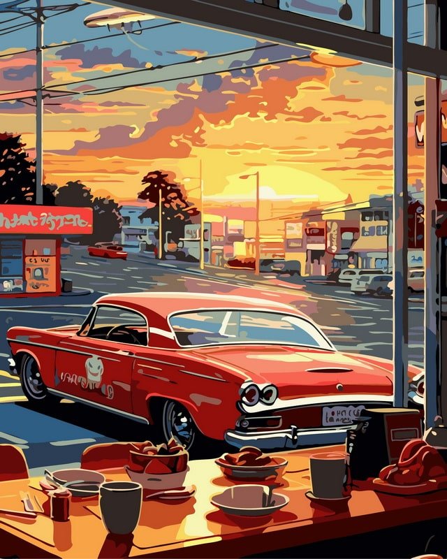 TPS “Retro raudonas automobilis „Sunset“ kavinėje”